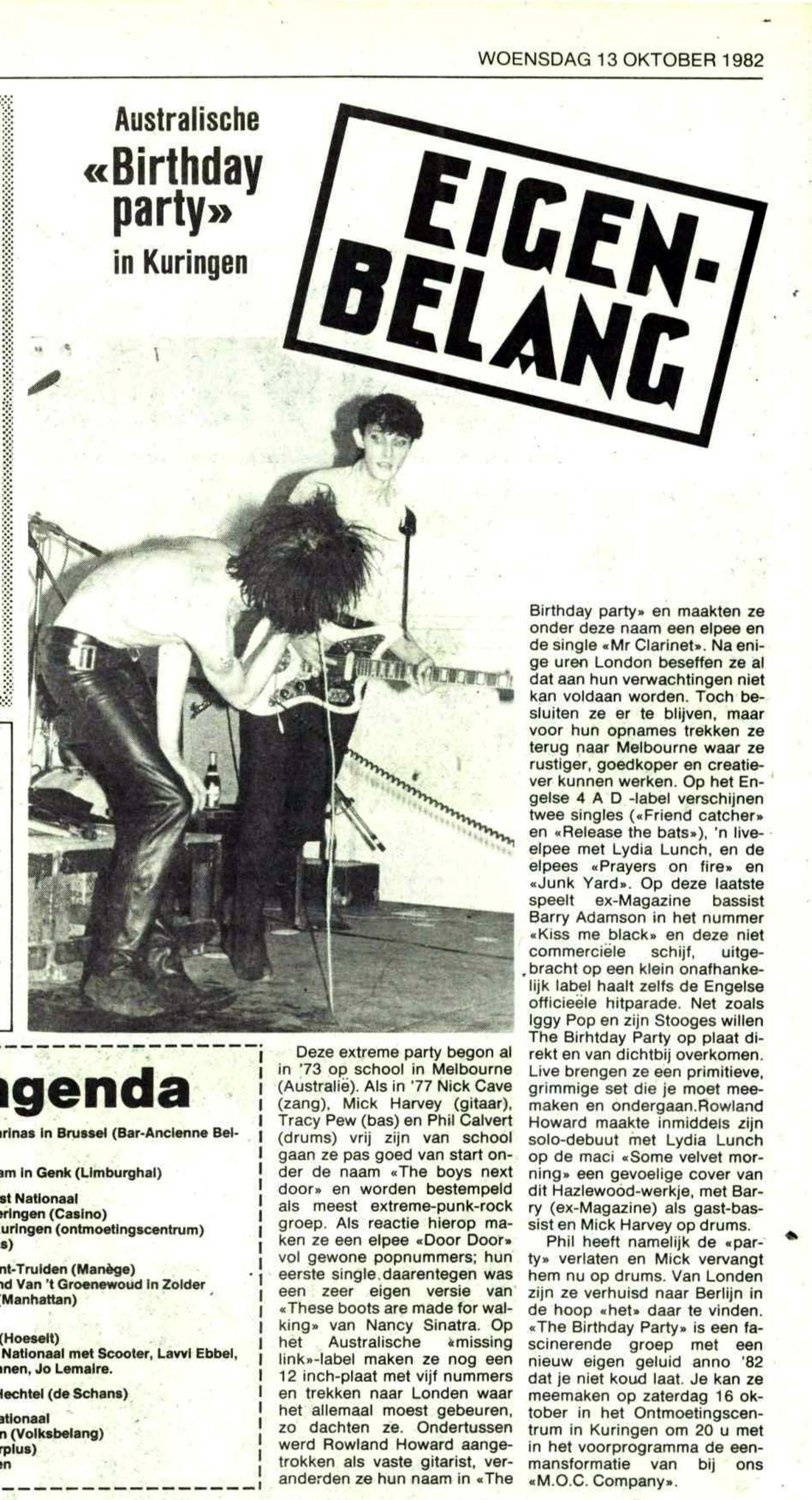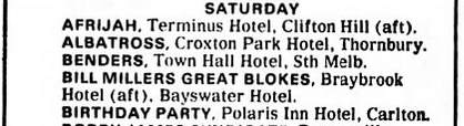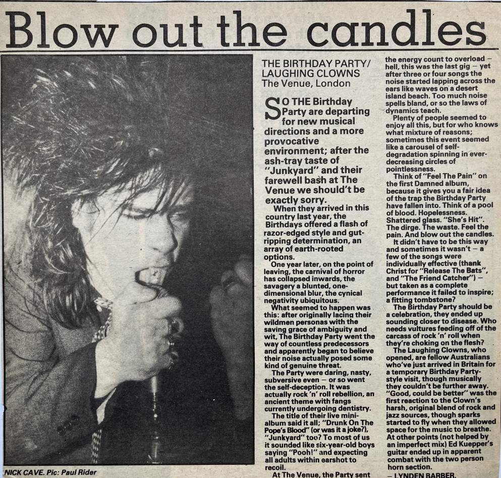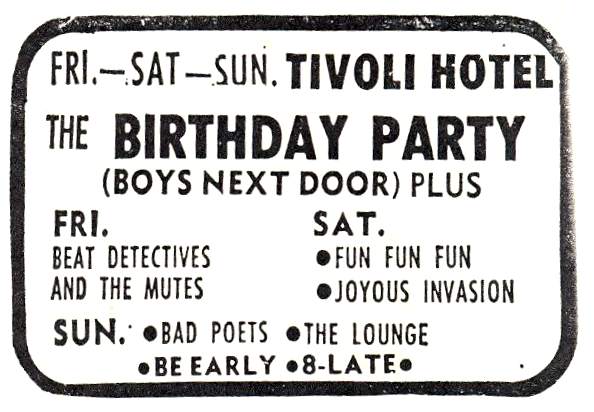 xx-Nov-80 Note: "As it so happens, Newcastle is my hometown and the first place I ever saw the much-hyped Birthday Party, who'd only just changed their name from The Boys Next Door and returned from England in late 1980. I hated them, Nick most of all, whom I regarded as a poseur and someone who held the audience in contempt. It was clear none of the band wanted to be in Newcastle at an RSL, playing to a half-empty room. Musically, they were hedged between the power pop of 'Door, Door', the Jarry-esque experimentalism of the 'Hee Haw' album and a pale vein of primitivism yet to open up with their 'Prayers on Fire' recording. It's likely Newcastle was just a warm-up show, testing out the old and the new and deciding what they would do next." Fan recollections from "Boy On Fire", a Nick Cave biography book by Mark Mordue (2020). |