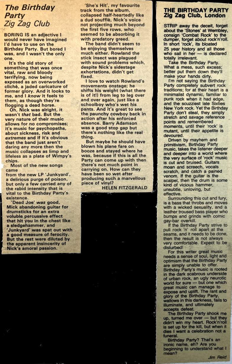 26-Jun-82 Setlist: Hamlet(Pow!Pow!Pow!)/ Dead Joe/ The Friend Catcher/ Release The Bats/ 6" Gold Blade/ Sad Dark Eyes [The Loved Ones]/ A Dead Song/ Junkyard/ (Sometimes)Pleasure Heads Must Burn/ She's Hit/ Big Jesus Trash Can. |