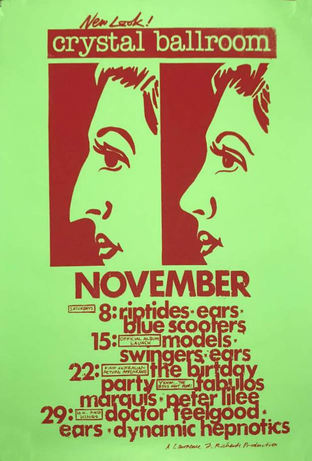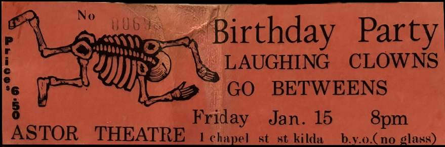 13-Dec-80 Setlist: Nick The Stripper/ Happy Birthday/ Zoo-Music Girl/ Yard/ Mr. Clarinet/ Let's Talk About Art/ The Friend Catcher/ Waving My Arms/ King Ink/ Guilt Parade/ The Hair Shirt. Note: Perhaps moved to the Crystal Ballroom, St.Kilda. |