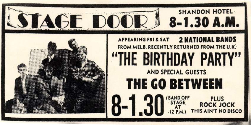 The band played their last show as the Boys Next Door on February 28th, 1980 in Melbourne at the Macy's club at Her Majesty's Hotel. They leave from Melbourne Tullamarine Airport for London (UK) on 29-Feb-80 at 8:40PM. Arriving in England they change their name to The Birthday Party. They live in poor circumstances and have to take day jobs to support themselves. |