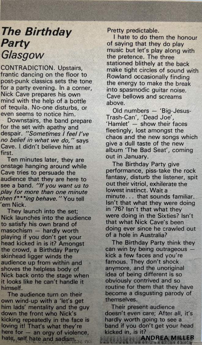 20-Jun-81 Setlist: (not in this order:) Figure Of Fun/ Cry/ Nick The Stripper/ Blast Off/ Zoo-Music Girl/ (Sometimes)Pleasure Heads Must Burn/ King Ink/ A Dead Song/ Release The Bats. |