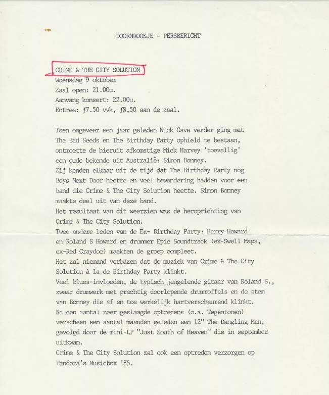 London late 1984. Ex-Birthday Party member Rowland S.Howard is recruited on guitar. After the demise of the Birthday Party in August 1983 Rowland had done basically nothing, except for guesting with Fad Gadget on stage at the Royal Albert Hall, London (on 30-Sep-83 and 01-Oct-83) in support of Siouxsie and the Banshees, joining the same Fad Gadget for the recordings of his "Gag" album in November 1983 and finally guesting at two Kas Product live concerts in France in April 1984. His brother Harry joins Crime on bass. Harry had replaced Tracy Pew in The Birthday Party at several UK live concerts during April/May 1982 when Tracy was serving time in an Australian prison. Epic Soundtracks (a.k.a. Kevin Paul Godfrey) [of Swell Maps, Red Crayola and Mute Records employee] will only join on drums as of their first live gigs in May 1985. During the life span of Crime and the City Solution (1985-1991), Mick Harvey continues to play an important role in Nick Cave's Bad Seeds. He is deviding his time between Bad Seeds and Crime. As a consequence, Crime only functions around Harvey's other commitments. |