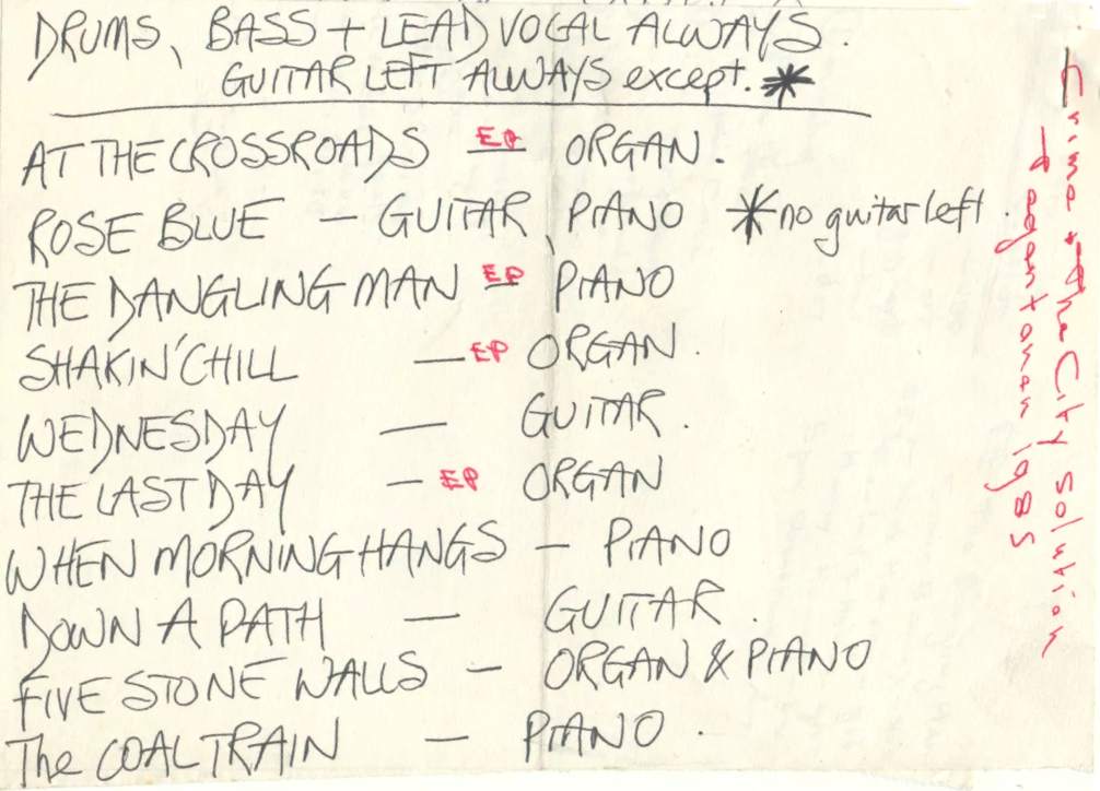 04-Oct-85 Setlist: Down A Path (a.k.a. The Blue Room)(*)/ The Coal Train/ Rose Blue/ The Dangling Man/ Trouble Come This Morning/ The Wailing Wall/ Five Stone Walls/ At The Crossroads/ The Last Day/ The Kentucky Click. |