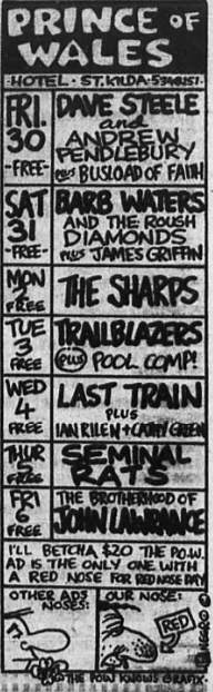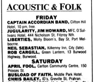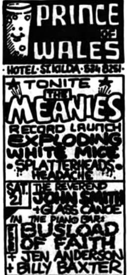 Note: By February Mick Turner, Jim White and Warren Ellis start their Dirty Three band, with shows at the Baker's Arms, Abbotsford.