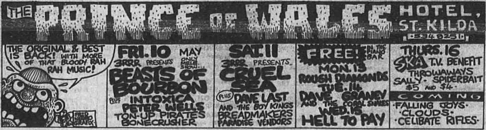 We performed our first show at the Prince of Wales on the following Wednesday night and it seemed to me that half the musicians in St Kilda were in attendance. This scared the shit out of me but it was too late not to do it so we did. I looked out into the audience and wondered how long I would have Warren in my band cos I could see that all the musicians in the audience wanted him too. I already knew Tony [Pola] and all the Beasts of Bourbon and they all came along. After we finished playing, Tony approached me and told me that he wanted to be our drummer. Tony turned up [at the next rehearsal] and fitted right in so from then on we were a four piece." Recollections by Megan Bawden (email February, 2025).