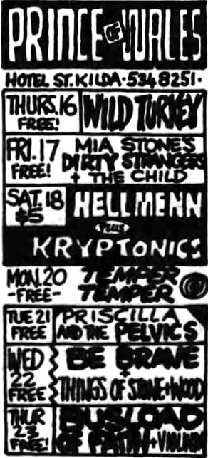 Note: Free entrance show. First show with Warren Ellis. "At the same time my friend, Neil Wedd, began booking the Prince of Wales in St Kilda. He booked Busload of Faith on a Wednesday, the first time the PoW had shows on a Wednesday. At that point I decided I'd like a violinist and did James know anyone. He said he did and that [the violinist] just come back to Melbourne after visiting Europe. James got in touch with him and we got together the next day at my place. I ran a tape of this audition/rehearsal. I knew straight away that Warren [Ellis] was the right musician for me. I also thought that for as long as he was with the band I was a lucky woman. We only had this one rehearsal before the first show. I gave Warren the tape to work with and off we went. We didn't really have a full set but as nobody had heard these songs before we did the first one again.