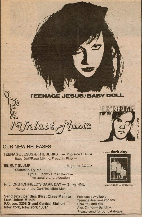 June 1979 US NY,New York City. Lydia disbands the group before leaving on a European tour with Teenage Jesus & The Jerks.