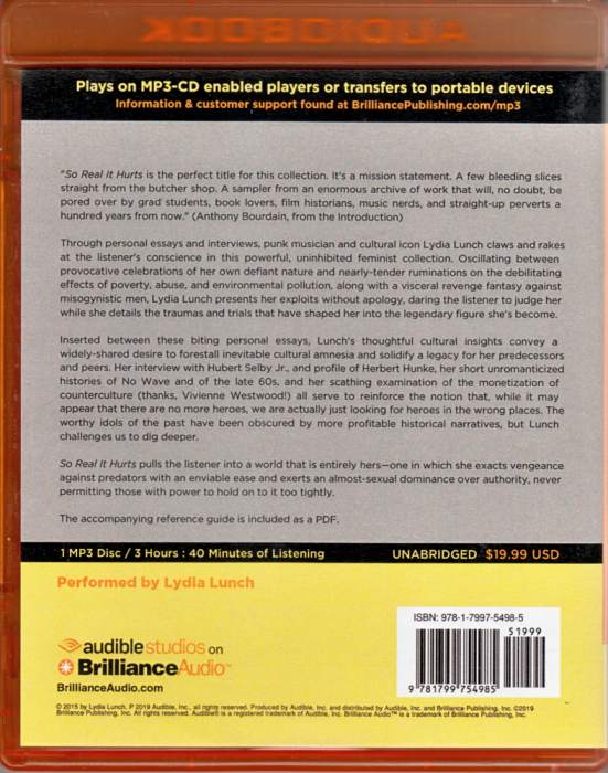 Notes: Lydia Lunch reads her "So Real it Hurts" book. Total time: 219 mins. Includes pdf of chapter 10 (Hubert Selby Jr: The Man Who Refused To Die -interview).