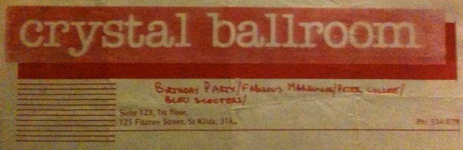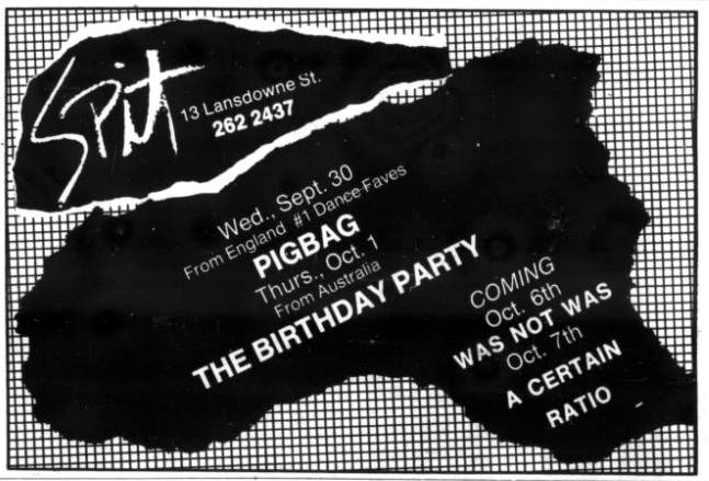 13-Dec-80 Setlist: Nick The Stripper/ Happy Birthday/ Zoo-Music Girl/ Yard/ Mr. Clarinet/ Let's Talk About Art/ The Friend Catcher/ Waving My Arms/ King Ink/ Guilt Parade/ The Hair Shirt. Note: Perhaps moved to the Crystal Ballroom, St.Kilda. |