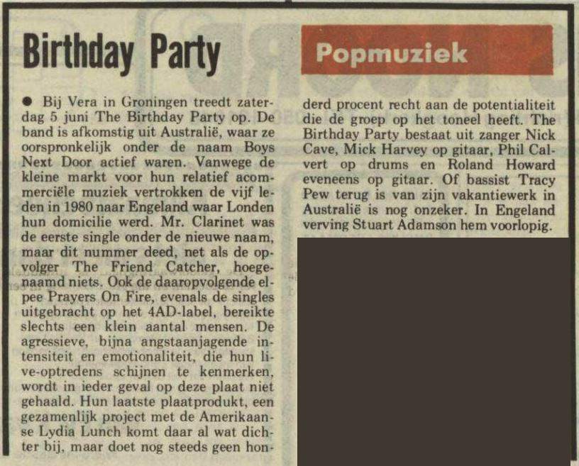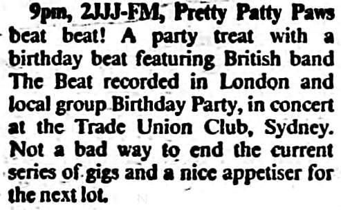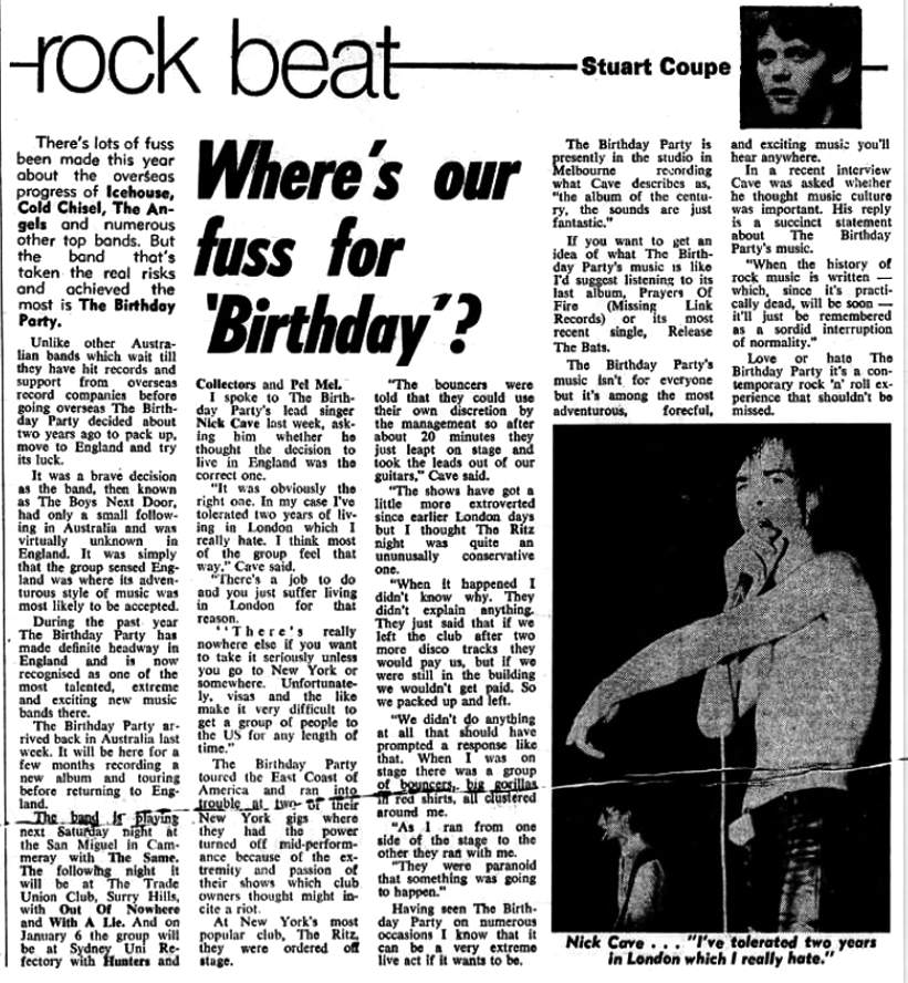 xx-Nov-80 Note: "As it so happens, Newcastle is my hometown and the first place I ever saw the much-hyped Birthday Party, who'd only just changed their name from The Boys Next Door and returned from England in late 1980. I hated them, Nick most of all, whom I regarded as a poseur and someone who held the audience in contempt. It was clear none of the band wanted to be in Newcastle at an RSL, playing to a half-empty room. Musically, they were hedged between the power pop of 'Door, Door', the Jarry-esque experimentalism of the 'Hee Haw' album and a pale vein of primitivism yet to open up with their 'Prayers on Fire' recording. It's likely Newcastle was just a warm-up show, testing out the old and the new and deciding what they would do next." Fan recollections from "Boy On Fire", a Nick Cave biography book by Mark Mordue (2020). |