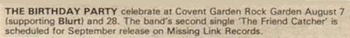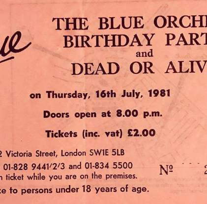 01-May-81 Setlist: Nick The Stripper/ Happy Birthday/ (Sometimes)Pleasure Heads Must Burn/ The Friend Catcher/ Figure Of Fun/ Yard/ Rowland Around In That Stuff/ A Dead Song/ King Ink/ Release The Bats/ Cry/ Catman [Gene Vincent]. |