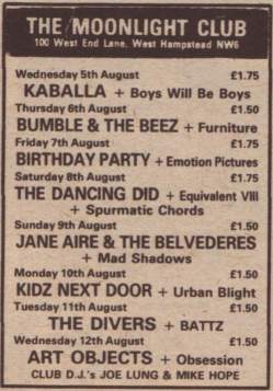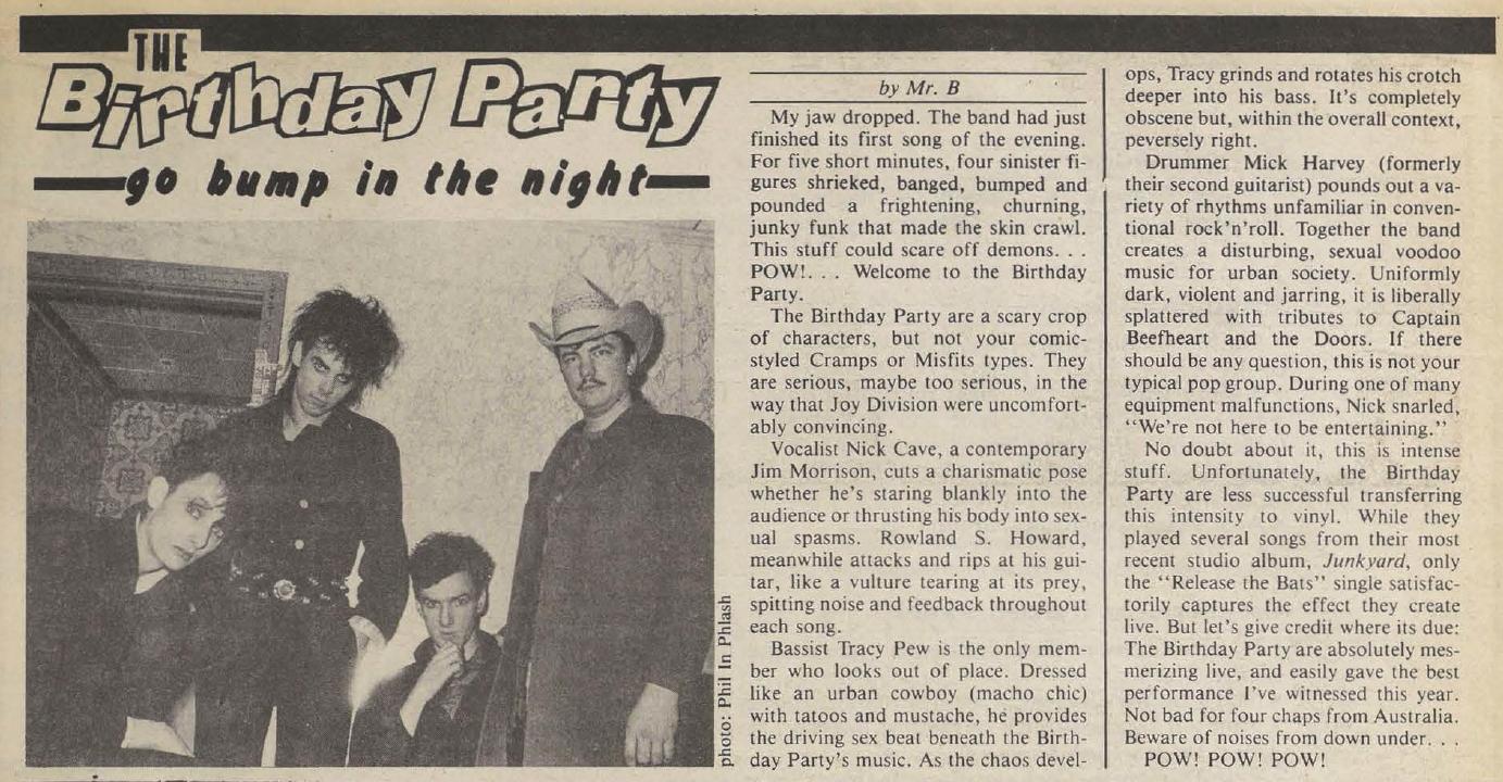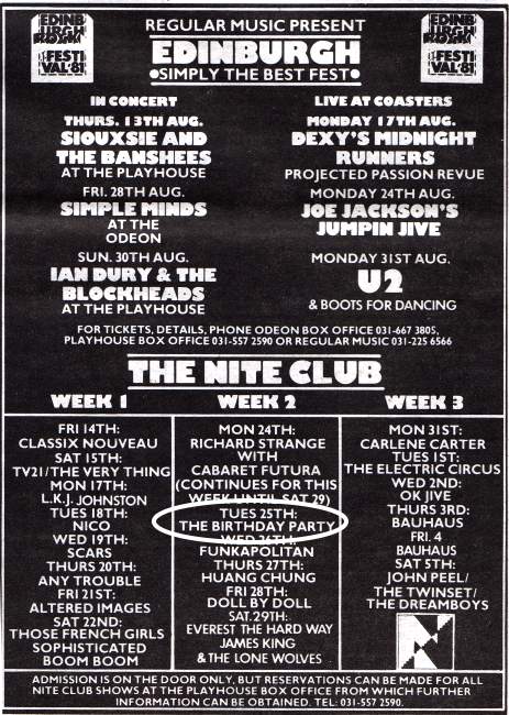 20-Jun-81 Setlist: (not in this order:) Figure Of Fun/ Cry/ Nick The Stripper/ Blast Off/ Zoo-Music Girl/ (Sometimes)Pleasure Heads Must Burn/ King Ink/ A Dead Song/ Release The Bats. |