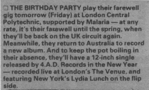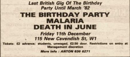 The band played their last show as the Boys Next Door on February 28th, 1980 in Melbourne at the Macy's club at Her Majesty's Hotel. They leave from Melbourne Tullamarine Airport for London (UK) on 29-Feb-80 at 8:40PM. Arriving in England they change their name to The Birthday Party. They live in poor circumstances and have to take day jobs to support themselves. |