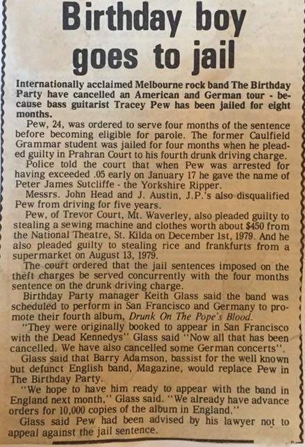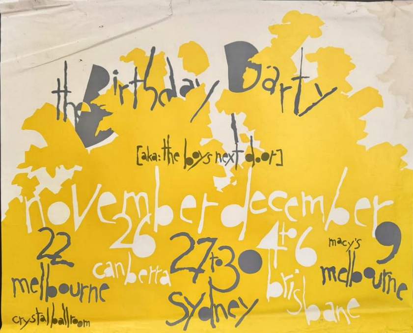 The band goes to New Zealand & Australia for a final string of concerts, organised by promoter Ken West. Mick Harvey stays in London, and is replaced on drums by New Zealander, Des Hefner (real name Simon Monroe) [of Marching Girls and Dead Can Dance], who had been enlisted for the tour via a phonecall from the Hansa Ton studios in Berlin, when the band were recording the "Mutiny!" EP.