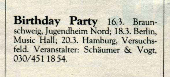 dates of studio recordings, all line-ups, trivia and other tall tales related to the Australian band The Birthday Party