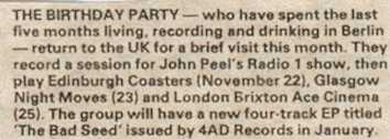 Oct/Dec-82 Note 1:"The four of us hadn't been there [329 Fulham Palace Road] long when the chance to reciprocate Melbourne hospitality came knocking. Nick and his girlfriend Anita Lane, and Birthday Party bassist Tracy Pew with partner Kate Jarrett, needing a place to crash after a Berlin recording session, bunked on the loungeroom floor. Winter was approaching, money scarce, and life in the crowded house became nocturnal.[..] Nick and Tracy had a test pressing of their Berlin recordings, The Bad Seed EP, with four very strong songs on it. This would have intimidated me in the past, being perhaps the most powerfully concise thing they ever did, but our album ["Before Hollywood"] was strong enough to follow it."From "Grant & I", a book by Robert Forster (Omnibus Press, 2018). |