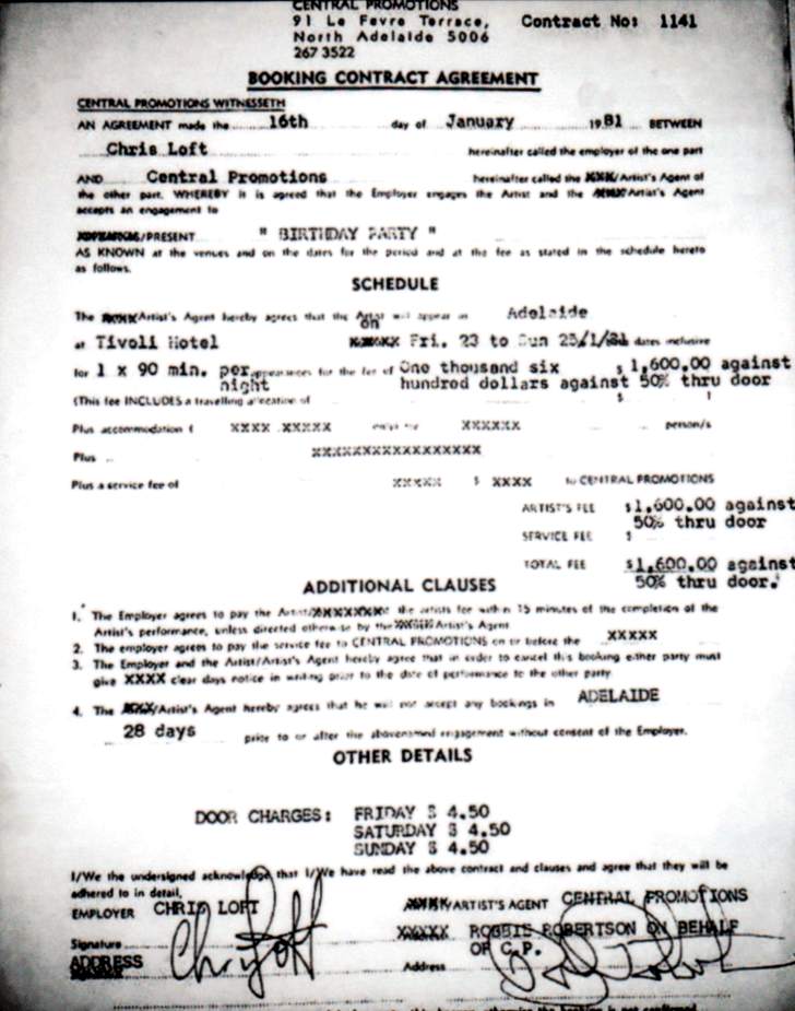22-Jan-81 Note: Start of the 2nd Australian tour, again organised by Ken West [Big Day Out fest]. On the first night [of the tour in Adelaide] at the Fantasia, Nick [Cave] wrapped his mike cord around Tracy [Pew] and dragged him across the stage. from "Nick Cave: The Birthday Party and Other Epic Adventures", a book by Robert Brokenmouth. During the set Rowland's guitar fails after which he's lend one from Rob, Dance Movie's guitarist. |