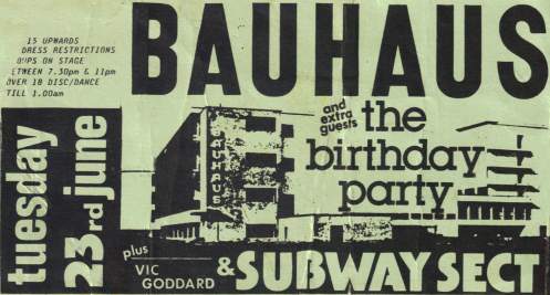 08-Jun-82 Setlist: Dead Joe/ 6" Gold Blade/ (Sometimes)Pleasure Heads Must Burn/ Sad Dark Eyes [The Loved Ones]/ Release The Bats/ Dead In The Head/ Hamlet(Pow!Pow!Pow!)/ A Dead Song/ Junkyard/ Big Jesus Trash Can/ She's Hit. |