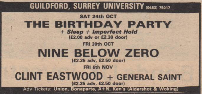 25-Feb-83 Setlist: Hamlet(Pow!Pow!Pow!)/ Pleasure Avalanche/ Say A Spell/ Dead Joe/ Wild World/ Fears Of Gun/ Deep In The Woods/ Six Strings That Drew Blood/ 6" Gold Blade/ Sonny's Burning/ Swampland. Ad: Scan of ad, taken from Leeds Student 18-Feb-83. |