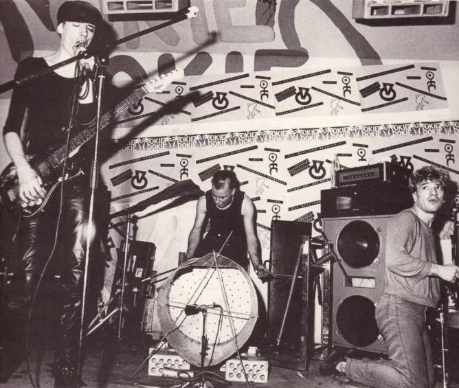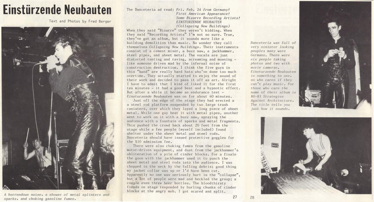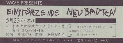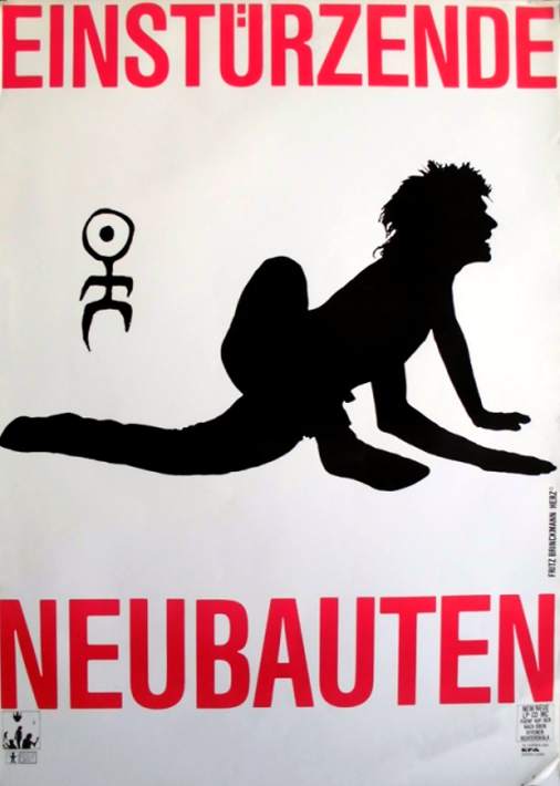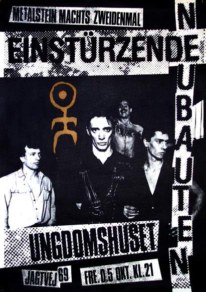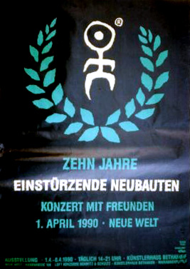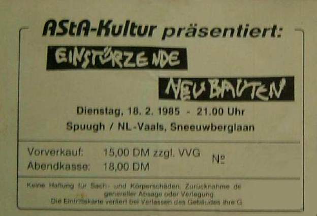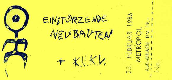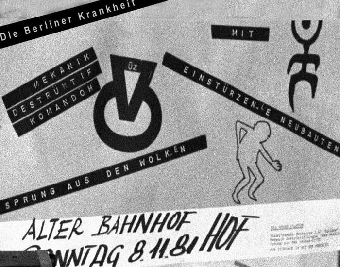 Note: Their first concert. About 50 people attend. They perform improvised music to Super-8 films and sound very much like a 'real' band with Blixa Bargeld on vocals and guitar, Beate Bartel on bass, Gudrun Gut on Korg MS-20 synthesiser and N.U. Unruh on real drums. Gudrun and Beate were at the time also in Mania D. The concert was recorded by the band and later sold as a cassette in Blixa's 'Eisengrau' shop. All tracks are available on the "Einstürzende Neubauten (Live In Kunstkopfstereo)" cassette, except (*) on the "Chaos-> Sehnsucht/ Energie" cassette.