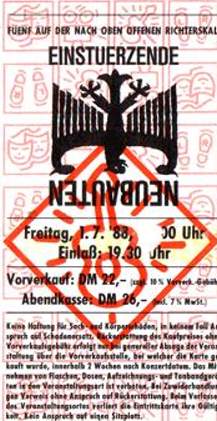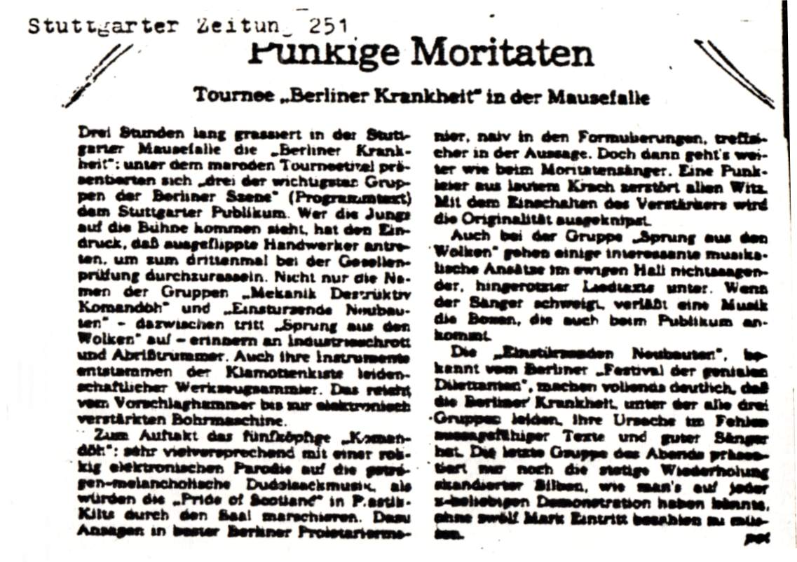 1980 The year in which the band is officialy founded. Recording and release of the "Für den Untergang" 7" and several live tapes. They only play a handful of live dates in Berlin with regular equipment and sound very much like a 'real' band. At the end of the year they will play in Hamburg (their first concert outside of Berlin).
