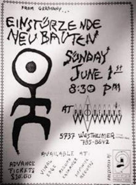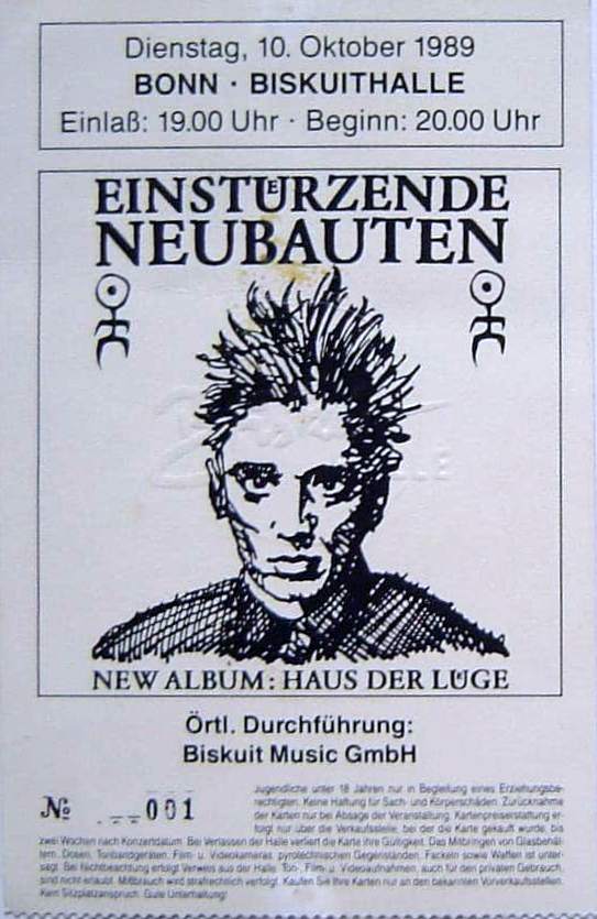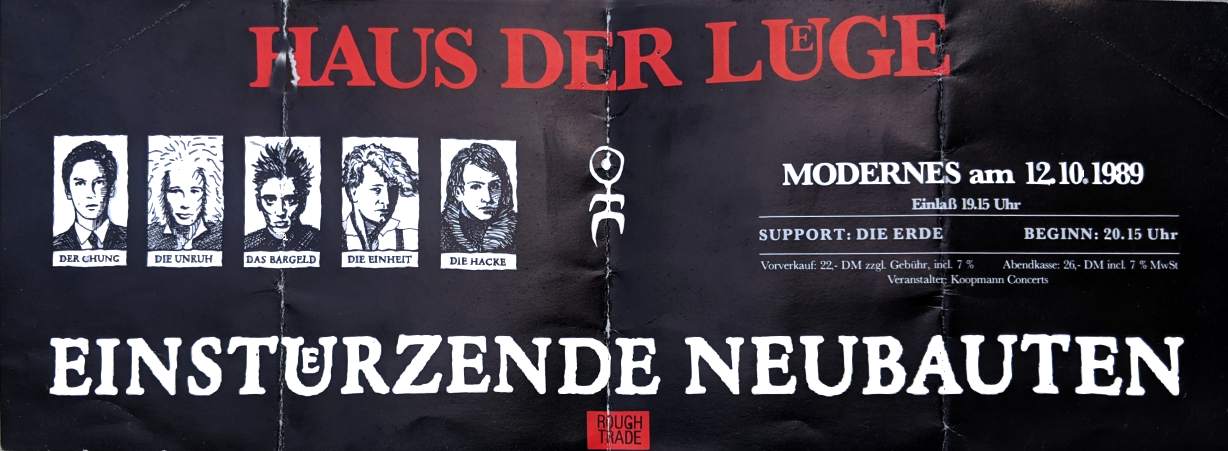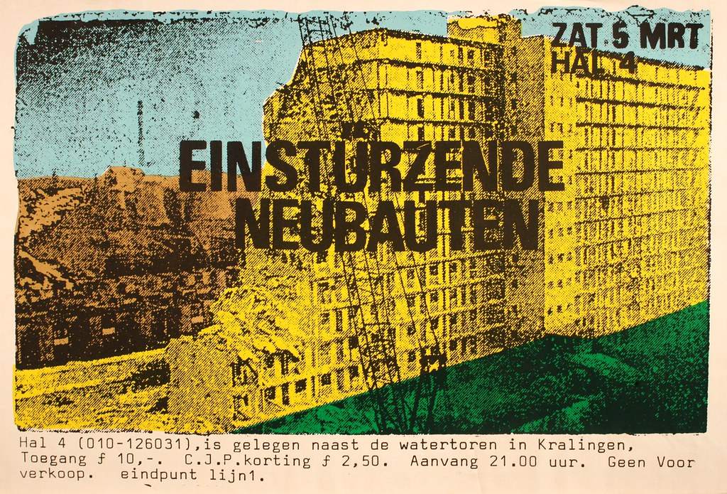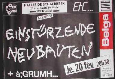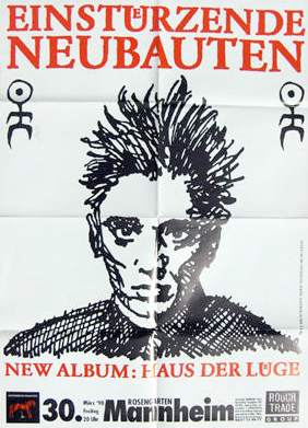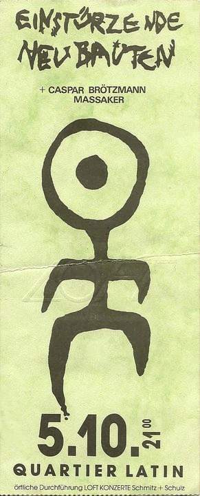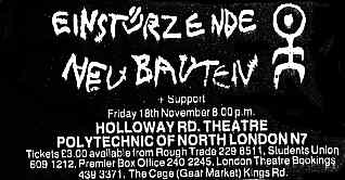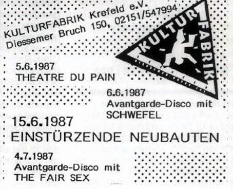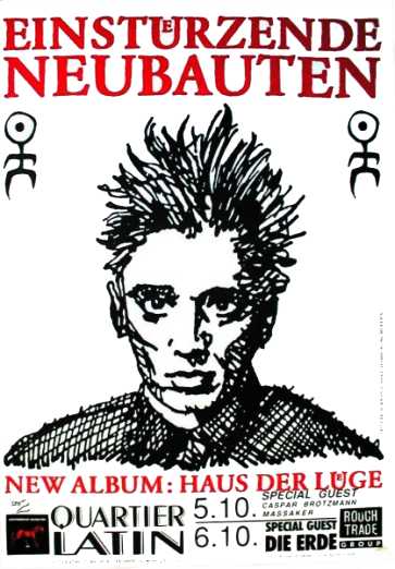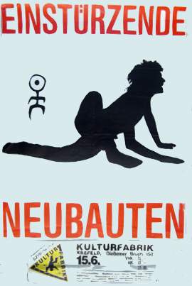 Note: Their fourth concert. With Chrislo Haas [DAF, Liaisons Dangereuses] instead of Gudrun Gut and possibly also with Susä Hobeck (who used to be in a pre-Neubauten band with Blixa, N.U. & Bettina Köster). Beate Bartel's last concert with Neubauten. Together with Gudrun Gut she focusses on their own band, Mania D.