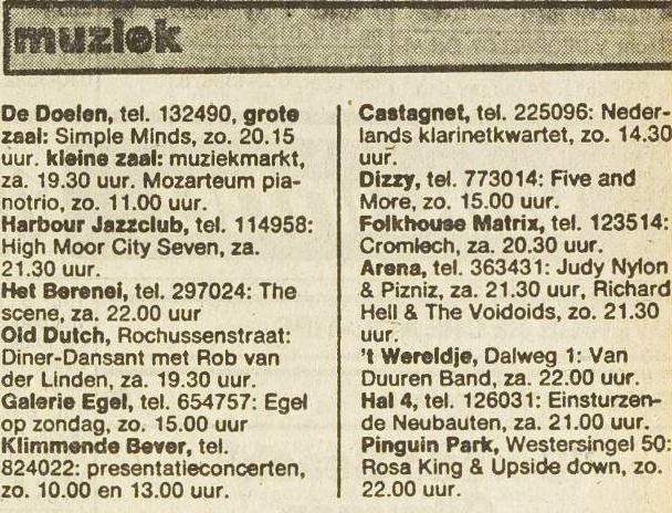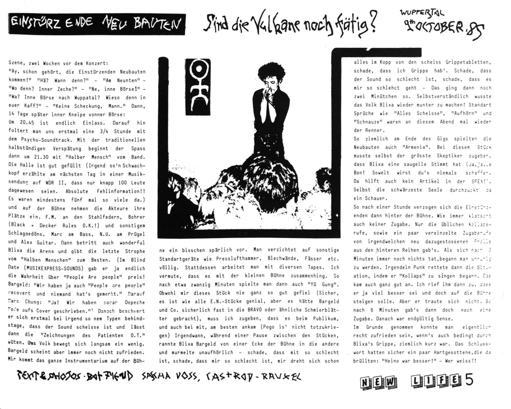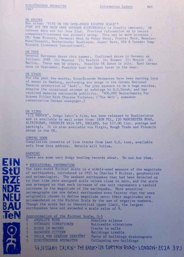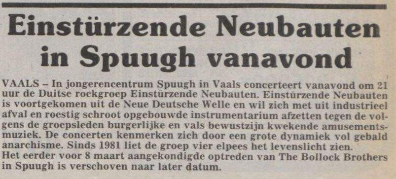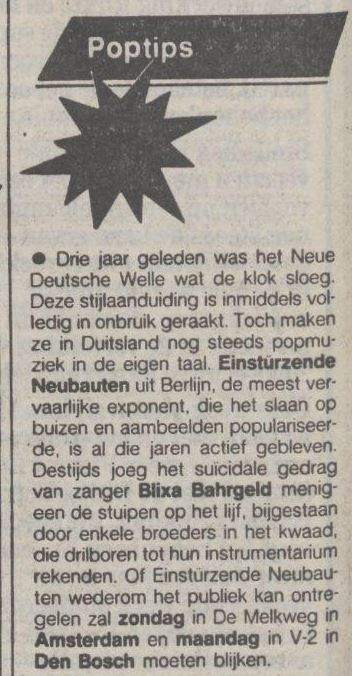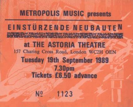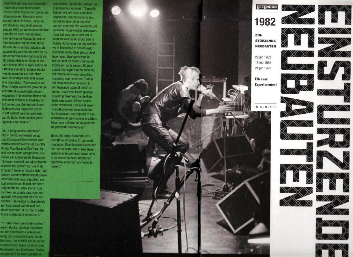 Note: Their fourth concert. With Chrislo Haas [DAF, Liaisons Dangereuses] instead of Gudrun Gut and possibly also with Susä Hobeck (who used to be in a pre-Neubauten band with Blixa, N.U. & Bettina Köster). Beate Bartel's last concert with Neubauten. Together with Gudrun Gut she focusses on their own band, Mania D.