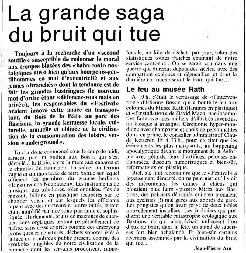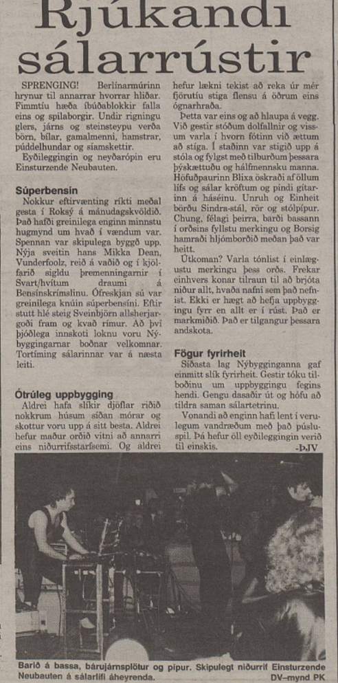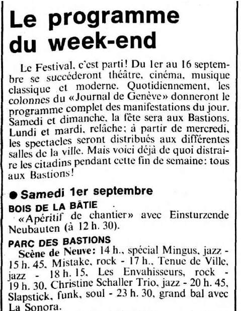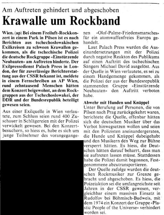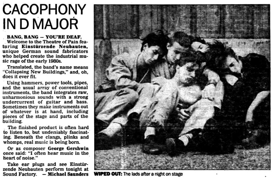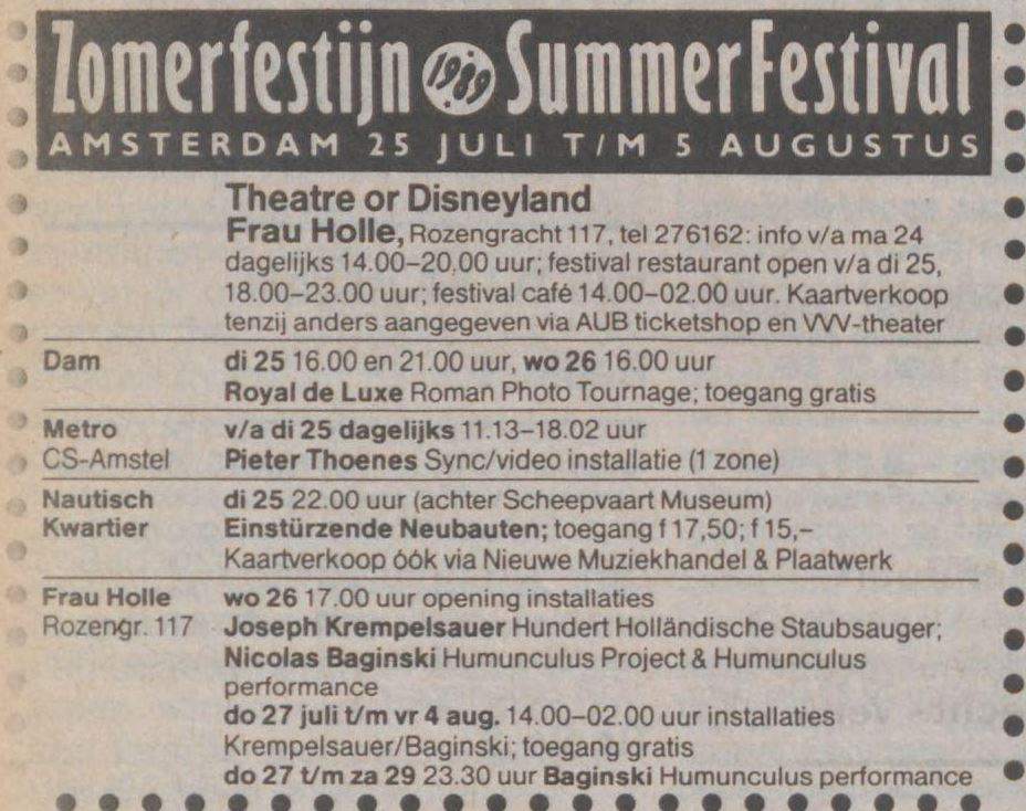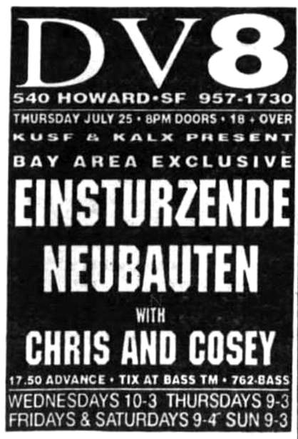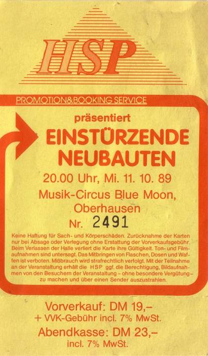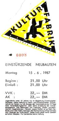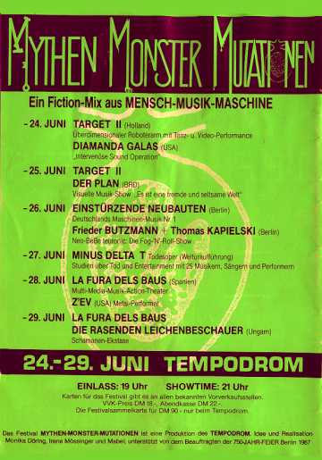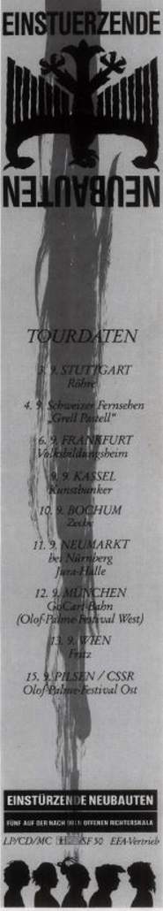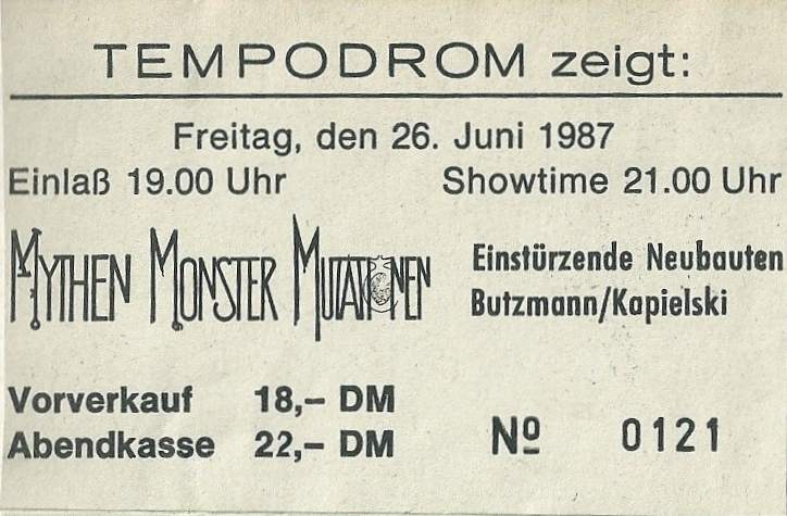Note: Four day festival, "Bild & Ton im Tempdrom", 27/28-August and 4/5 September. Also performing were Kriegsschauplatz Tempodrom/ Nekropolis-Die Unbekannten / Wir und das Menschliche e.V. (Frieder Butzmann and Alex Kögler)/ Leben und Arbeiten/ Die Tödliche Doris/ Gudrun Gut & Blixa Bargeld/ Vroammm!/ Drei Mädels & Das Meer (Ulla, Beatrice, Gudrun Gut & Alex von Borsig or Alex Kögler)/ Sprung aus den Wolken (Kiddy Citny)/ Sentimentale Jugend (Christiane F. & Alex von Borsig) and Din A Testbild.