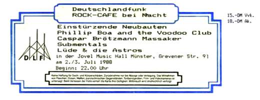 A festival organised by Blixa Bargeld, Wolfgang Müller [Die Tödliche Doris] and Mabel Ascheneller, and presented by Wieland Speck. A video was made available (only for rent) from Speck-Productions, but remained largely unseen until it was transferred to DVD in 2005 and properly released (as part of a box with CD/2LP and booklet) by Vinyl-On-Demand. Also available on the "Berliner Dillettanten" bootleg tape.