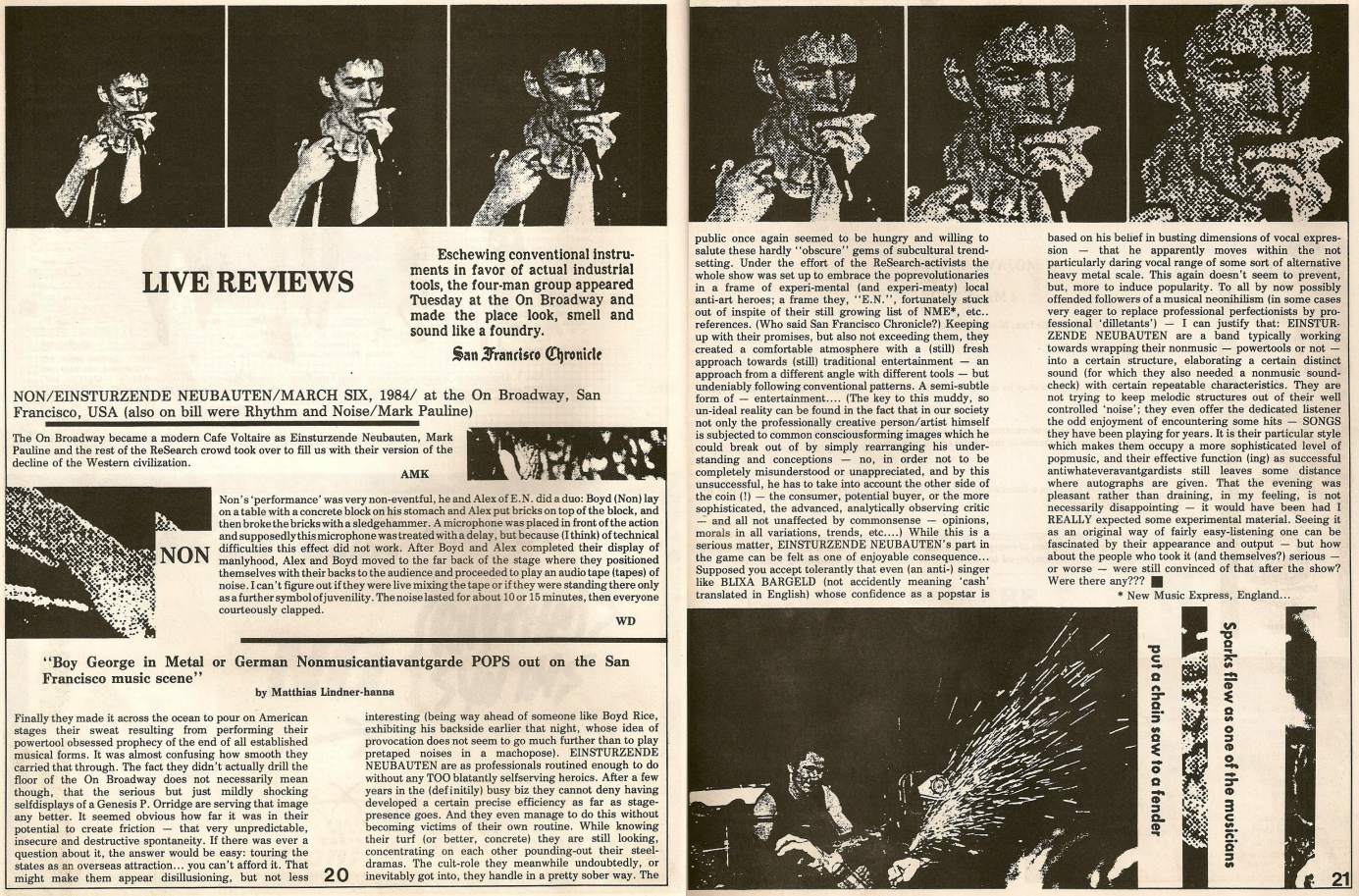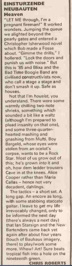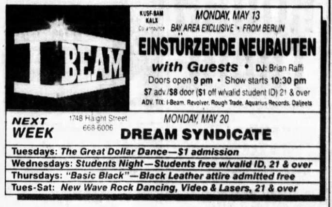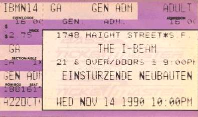 Note: They perform in 2 rooms of the small bar at the same time. Blixa runs back and forth between the 2 rooms and shouts the lyrics into the stunned audience members' ears. Mark Chung (then still in Abwärts) joins for this concert on bass.