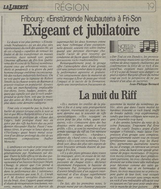 Note: Ballet-piece by the Canadian La La La Human Steps dance company for which Einstürzende Neubauten composed the music (but do not play it live on stage). Choreography by Edouard Lock. Additional music by David Van Tieghem, Skinny Puppy and Janitors Animated.