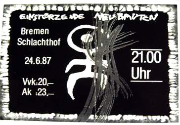 Note: Festival organised by Alfred Hilsberg (Zick Zack records label). Their first concert outside of Berlin. With Alex von Borsig (a.k.a. Alexander Hacke) joining N.U. Unruh on drums. They decide to play after (local band) Abwärts, because they were afraid the violent Hamburg punks would beat them up (like they did with the other non-Hamburg bands Wirtschaftswunder and Die Radierer). Most people left after Abwärts. At this concert Blixa and FM Einheit [a.k.a. Frank Martin Strauss, then in Abwärts] meet for the first time.