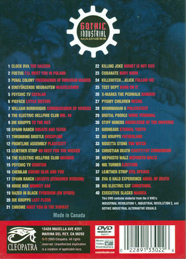 Notes: Compiles 40 bands from "Industrial Revolution Vol.1" VHS, "Industrial Revolution Vol.2" VHS and "Gothic Industrial Alternative Visuals" VHS.