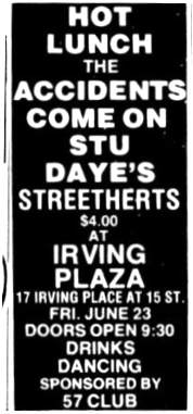 Note: Tom Carson (in the "Riffs" section of the Village Voice of 10-Apr-78) described Hot Lunch's performance as follows: "[Hot Lunch] combine Doors-style rhetoric with Tuff Darts's brutalized, cynical posturing, and don't bring a shred of originality or feeling to either". He also described the Cramps show as "uterly sterile".