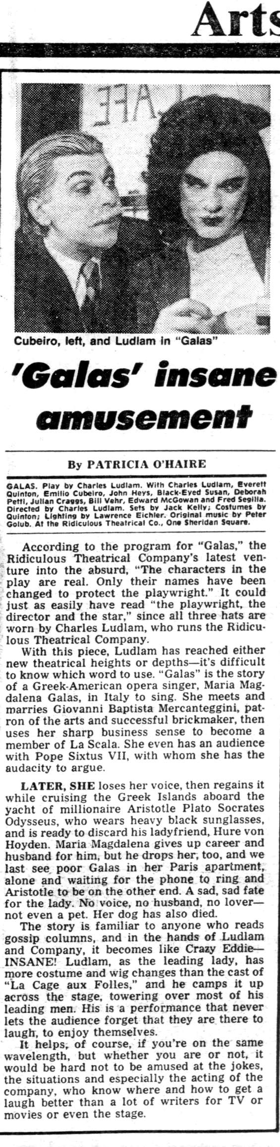 Info: Premiere of "Galas" , a play written and directed by Charles Ludlam.