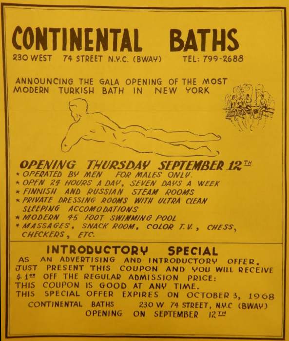 From "Trash!" (by Kris Needs and Dick Porter) page 45: "On 29 May, the Dolls made a return to the Palm Room [...] Supported by (Warhol superstar) Jackie [Curtis], [the New York Dolls] landed a two-night booking at one of Brooklyn's [Continental Baths were located in Manhattan, ed.] many gay bathhouses. [...] the Continental Baths was the most oppulent and well-known bathhouse in the city. [...] owner Steve Ostrow was instrumental in liberalising the city's laws on sex clubs [...].