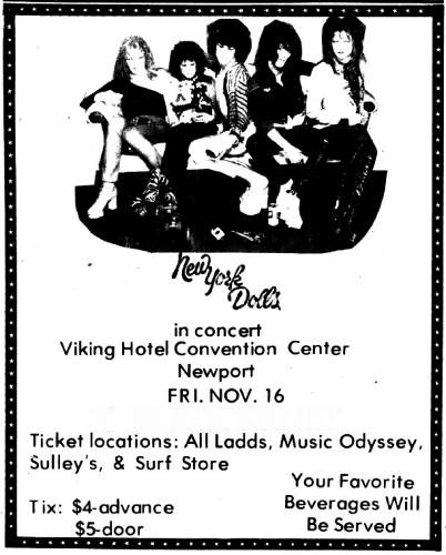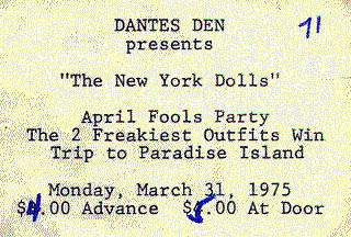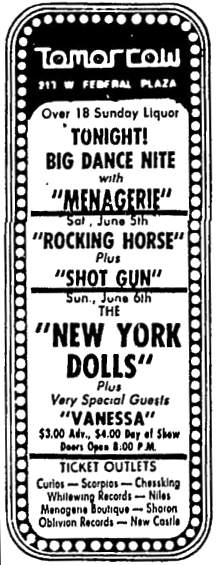 This event was the Dolls first -known- paid ($15) show. Event labeled as "Video rock - Electronic Excorcise". [...] we dressed the way we always dressed; we rehearsed the way we always rehearsed; and we were going to play the songs we always played - 'Subway Train', 'Personality Crisis', 'Looking For A Kiss', Bo Diddley's 'Pills', all the numbers that became the standard early Dolls repertoire. There wasn't a huge crowd - it was mainly people we knew, and people who The Magic Tramps knew, and people who Satan The Fire Eater knew. But they loved us." From Syl's book "There's No Bones in Ice Cream".