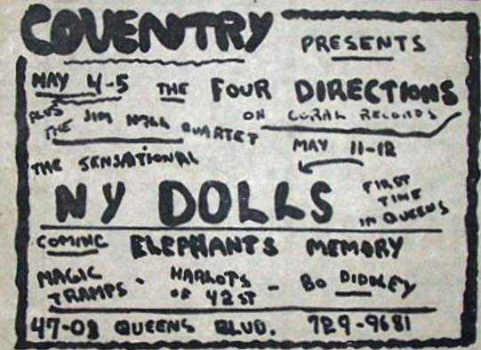 Note: The rehearsal was taped and made available on the "Actress: Birth Of The New York Dolls" CD (Get Back 2000). "Actress" is often referred to as the name of the early Dolls, but was never actually used. Incidentally in 1974 there would be an actual NY band called Actress, playing plenty of concerts at the Coventry.