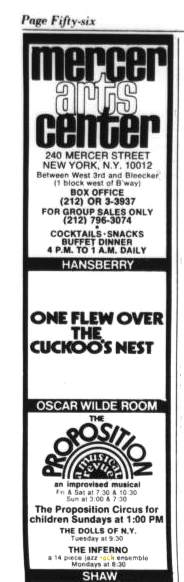 Note: The MAC was rented and remodeled between March 1970/December 1971 by (former sports car racer) Seymour -Sy- Kaback and his wife Cynthia at the rear entrance of the (1870 opened) Broadway Central Hotel -which was by the 1960s a well-known dump/welfare hotel (renamed to Hotel University)- @ 240 Mercer Street. The center held its grand re-opening on December 20, 1971, but the upper floors of the former hotel remained derelict and populated with vagrants and drug users. The Kitchen's (in the hotel's former kitchen) opened on June 15, 1971. The remodeledMAC consisted out of thirtheen spaces: on the main floor the Hansberry theater (299 seats), the Brecht theater (199 seats) and a Service bar; on the second floor the O'Casey theater (299 seats), the Shaw Arena theater (224 seats), the Oscar Wilde Room theater (200 seats), the Kitchen video studio and performance space (199 seats), the Obie Alley bar, the Cabaret/DMZ Lounge night club, two acting schools/studios (Gene Frankel Theater Workshop and Viveca Lindfors' "An Actor Works"), the Zoo boutique and a rehearsal hall.