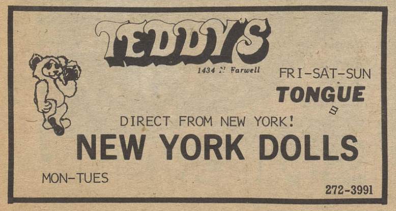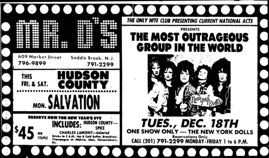 In 1972, the New York Dolls did two live show at a bath house. This event is often mixed up (both date and location) and is most likely to have happened at the, better-known, Continental Baths (in Manhattan). There's no evidence they ever played the Man's Country bathhouse although the accounts (of Sylvain and Arthur) below refer to it.