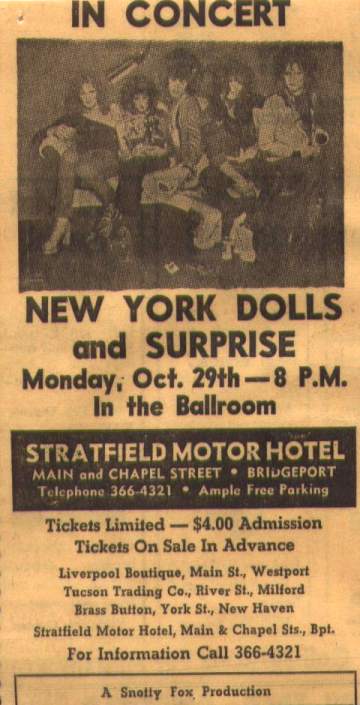 Accounts: From "Too Much Too Soon" (by Nina Antonia) page 31: "On May 29, 1972, The New York Dolls played their second date in the Palm Room of the Diplomat Hotel [...] The Dolls did their next two dates,[..] with (Warhol superstar) Jackie Curtis supporting, in the steamy setting of a gay bath house in Brooklyn [Continental Baths were located in Manhattan, ed.] Arthur:"We did these very weird shows with Jackie [Curtis] at these baths. It was like there was no audience because all the guys stayed in their cubicles having sex with someone...".
