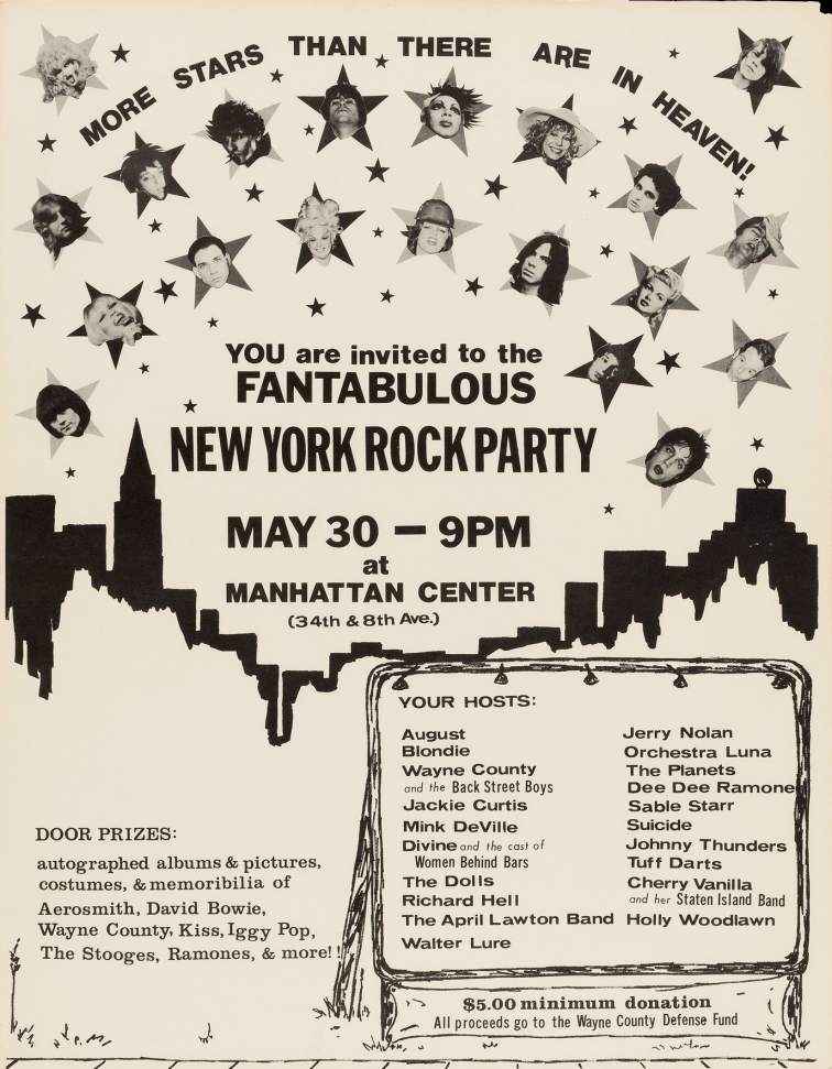 During a show at CBGB's (March 1976) Wayne County had smashed a microphone stand over Dick Manitoba's [of The Dictators] collarbone when Dick was heckling him. Dick Manitoba had to be hopitalized and sued Wayne for it. Other bands artists performing at this benefit are: Walter Lure/ Blondie/ Jerry Nolan/ Wayne County & Back Street Boys/ The Planets/ Jackie Curtis/ Dee Dee Ramone/Mick Ronson/ Mink DeVille/ Suicide/ Divine/ Johnny Thunders/ Tuff Darts/ Richard Hell/ Cherry Vanilla & her Station Island Band/ Ian Hunter/ The April Lawton Band and Holly Woodlawn. All proceeds go to the Wayne County legal defence fund.