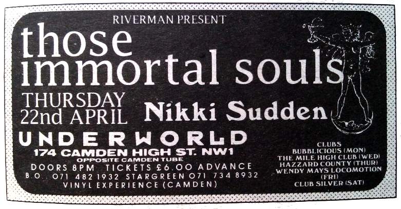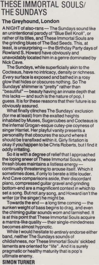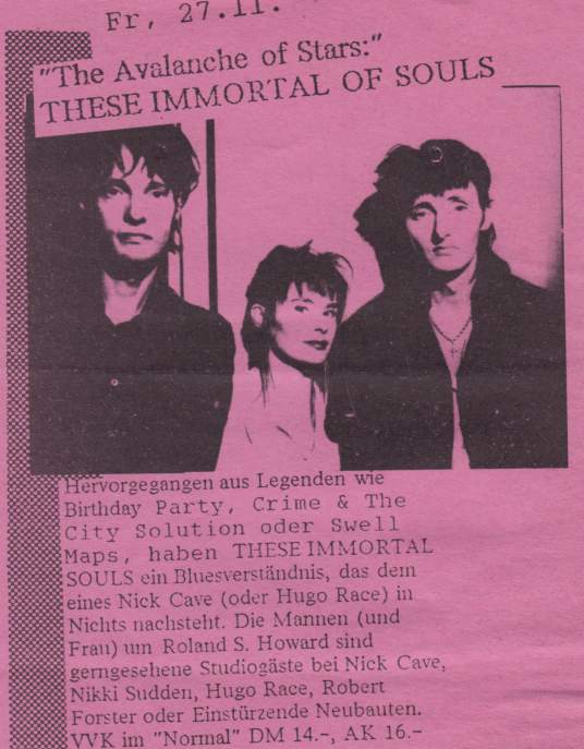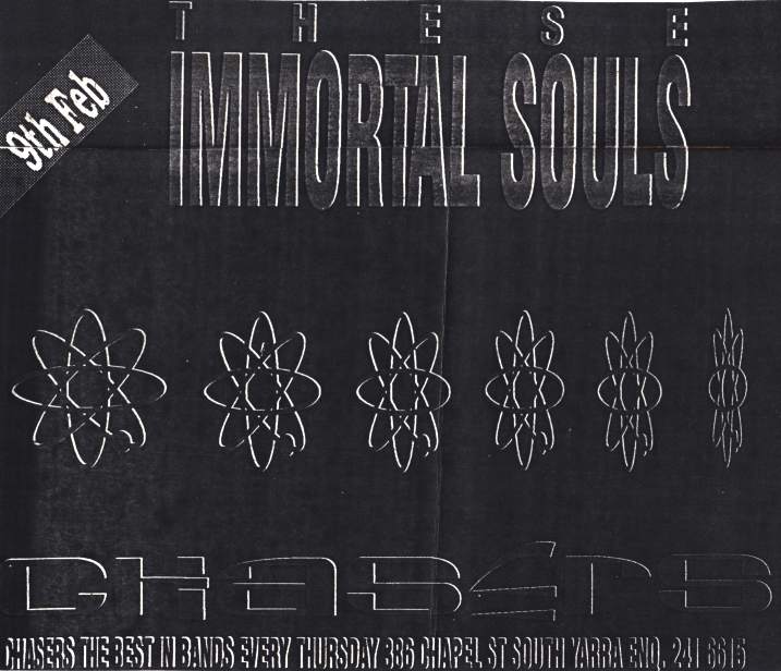The years in which they return to Melbourne (1989), do a few gigs as These Immortal Souls, Rowland teams up with Hugo Race [True Spirit] for a couple of concerts and both Rowland and Hugo star in John Tatoulis' "In Too Deep" film, then they get back to London (1990) for a handful of live gigs (with Sonic Youth), and finally the band is put on hold when Rowland with brother Harry join Lydia Lunch's Shotgun Wedding project (1991) in Memphis, USA. |