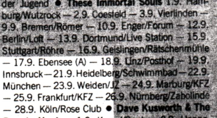The band returns to Melbourne, Australia. Chris Hughes remains in Europe, as member of Hugo Race's True Spirit band. Rowland assembles a new/temporary version of These Immortal Souls, which tours in January/February 1994. |