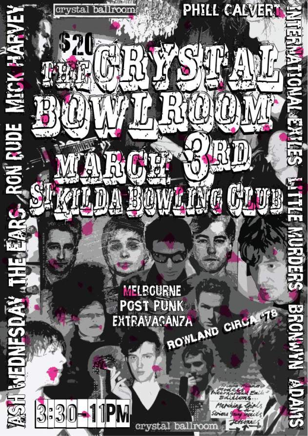 Note: Event dedicated to the (in)famous Crystal Ballroom scene. The Bowling Club is located across the road from the closed Crystal Ballroom. Event line-up: 4:30 Bronwyn Adams, 5:30 Ash Wednesday, 6:30 Little Murders, 7:30 Mick Harvey (vocals/guitar) with Angela Howard (bass) and Ron Rude (guitar) and Phill Calvert (drums), 8:30 The Ears and at 9:30 International Exiles.