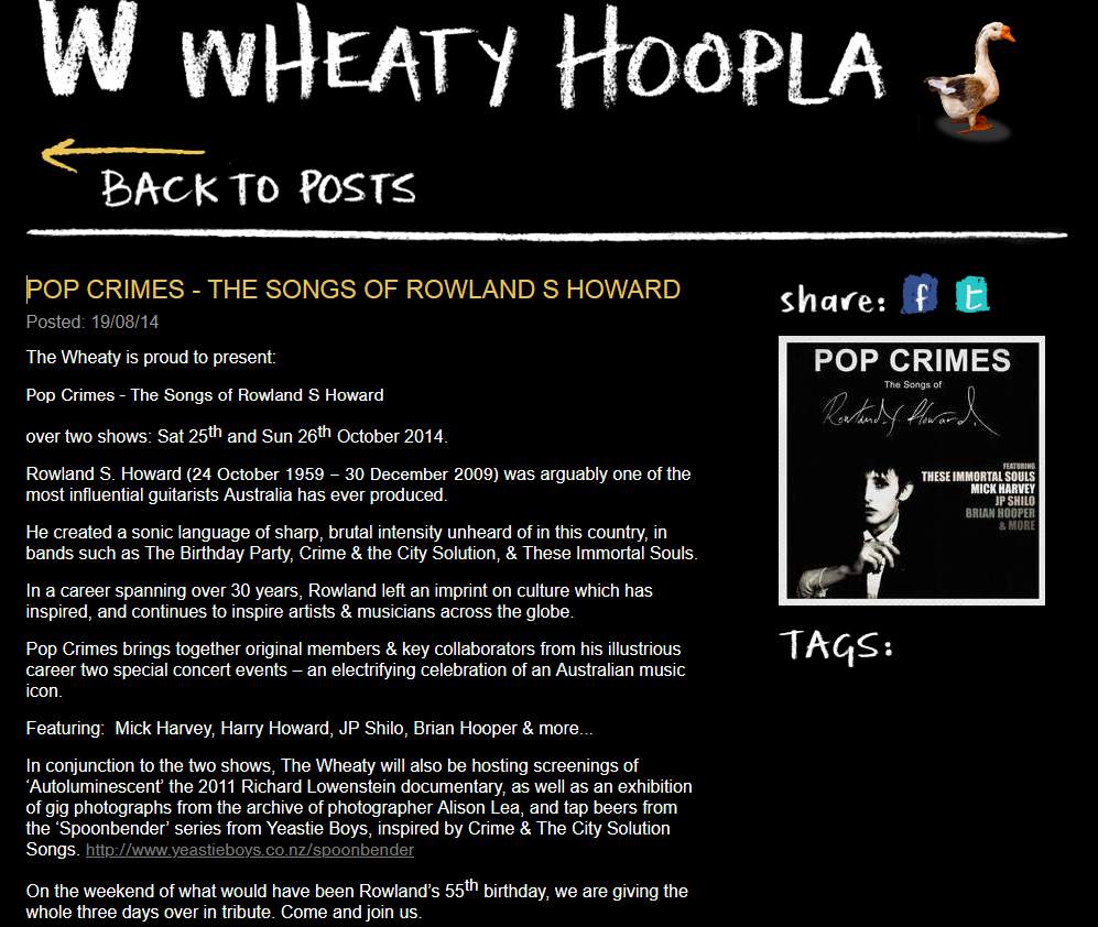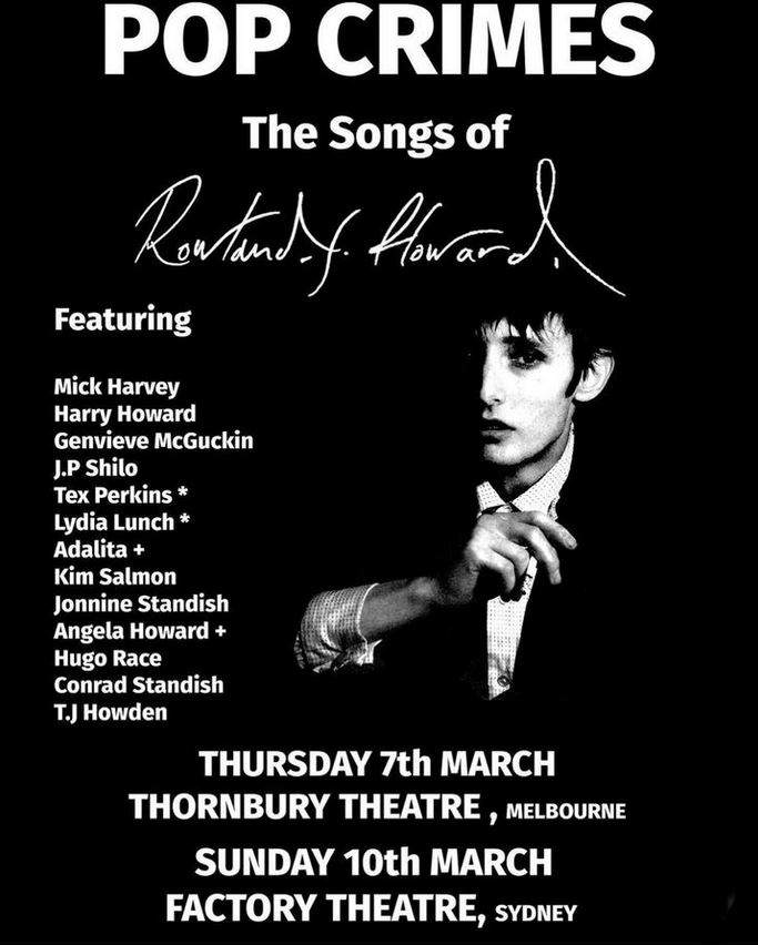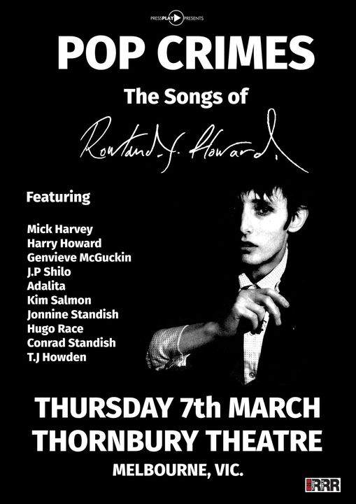 Note:"Pop Crimes" tribute series. 24-Oct-14 would have been Rowland's 55th birthday. In conjunction to the two shows, The Wheaty hosts screenings of "Autoluminescent" the 2011 Richard Lowenstein documentary, as well as an exhibition of (Birthday Party 1981) gig photographs from the archive of photographer Alison Lea.