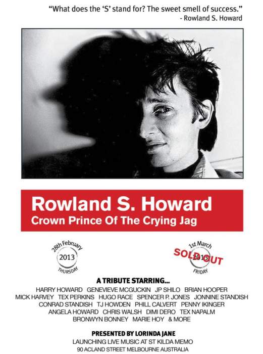 Note: "Crown Prince Of The Crying Jag", covering the music of the late Rowland S.Howard from The Young Charlatans, The Birthday Party, These Immortal Souls and Rowland's solo albums. Event line-up: Bronwyn Adams/ Phil Calvert/ Dimi Dero/ Dave Graney/ Mick Harvey/ Brian Hooper/ Angela Howard/ Harry Howard/ Tim J.Howden/ Marie Hoy/ Penny Ikinger/ Spencer P.Jones/ Genevieve McGuckin/ Tex Napalm/ Tex Perkins/ Hugo Race/ J.P.Shilo/ Jonnine Standish/ Chris Walsh and Craig Williamson.