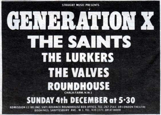 04-Dec-77 UK London-Camden,Roundhouse (@ Chalk Farm) [support for Generation X, with The Lurkers and The Valves]