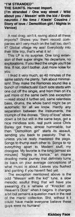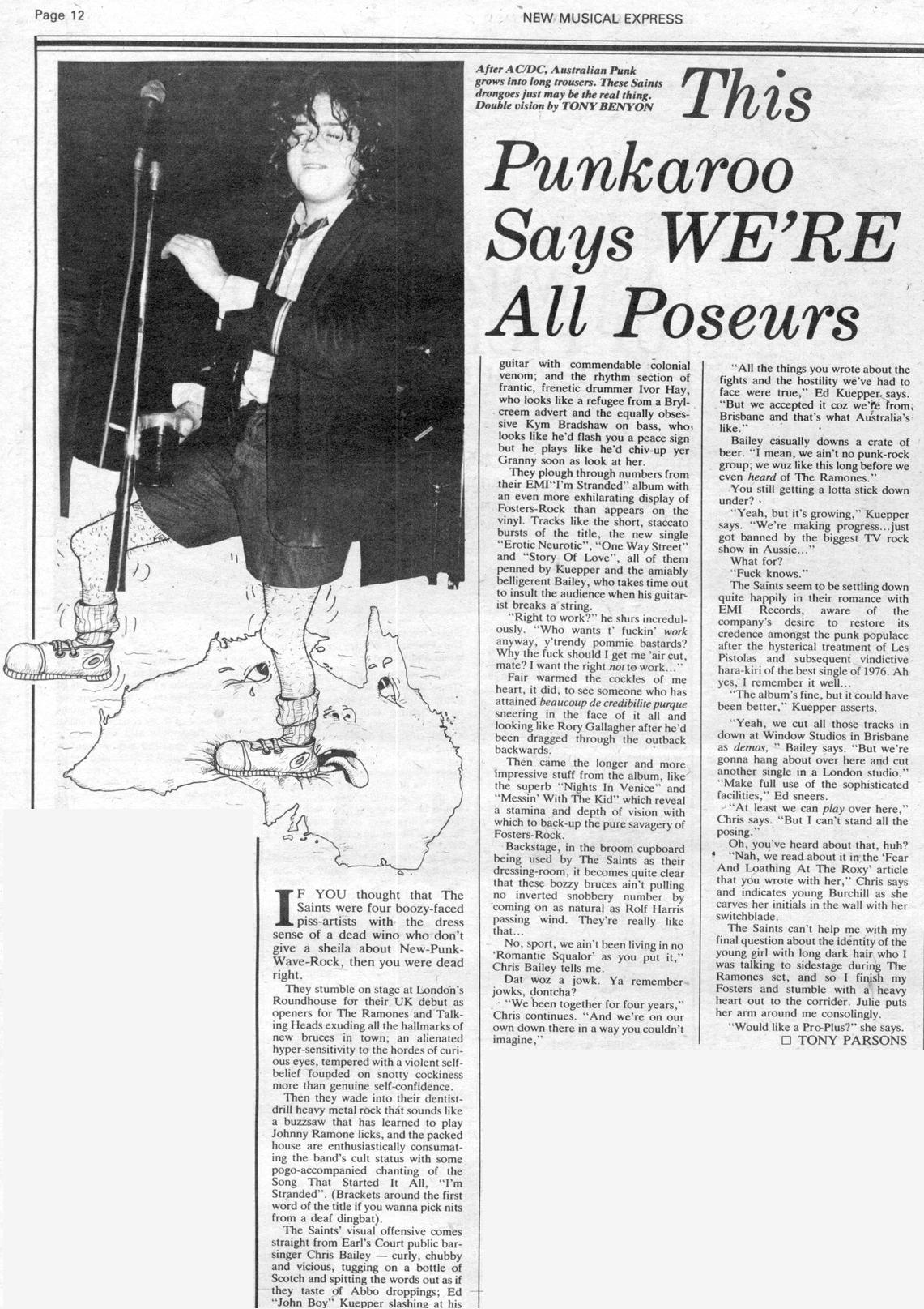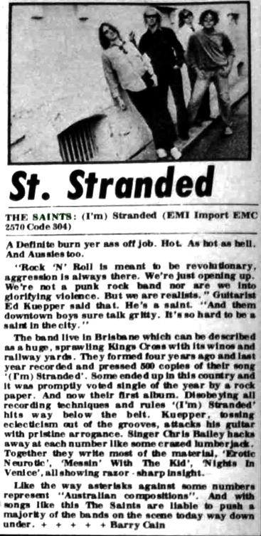 Note 2: "Just before the record ["(I’m) Stranded" single] was recorded our bass player [Doug Balmanno] left in highly scandalous circumstances and Kim Bradshaw joined the band. He's the first fourth member who's been enthusiastic about our stuff." Ed Kuepper in Sniffin' Glue #4 - Punk zine, October 1976. Doug Balmanno joined (folk artist) Eric Bogle's band, later in 1980. Bogle became known for his song "The Band Played Waltzing Matilda", covered (among many others) by The Pogues.