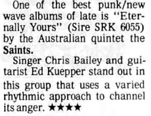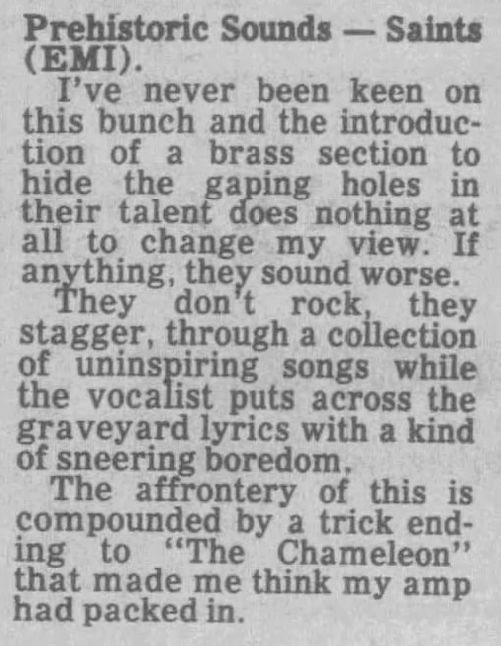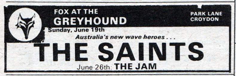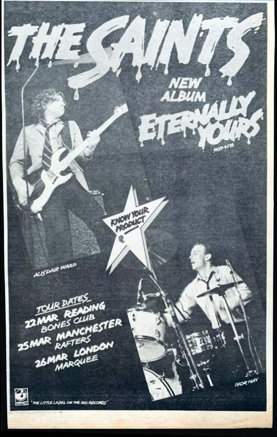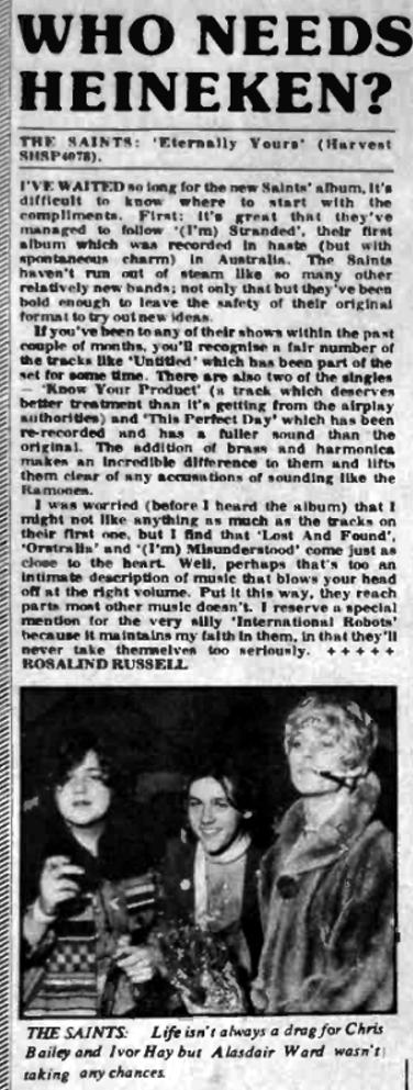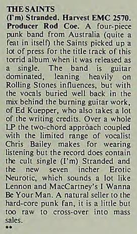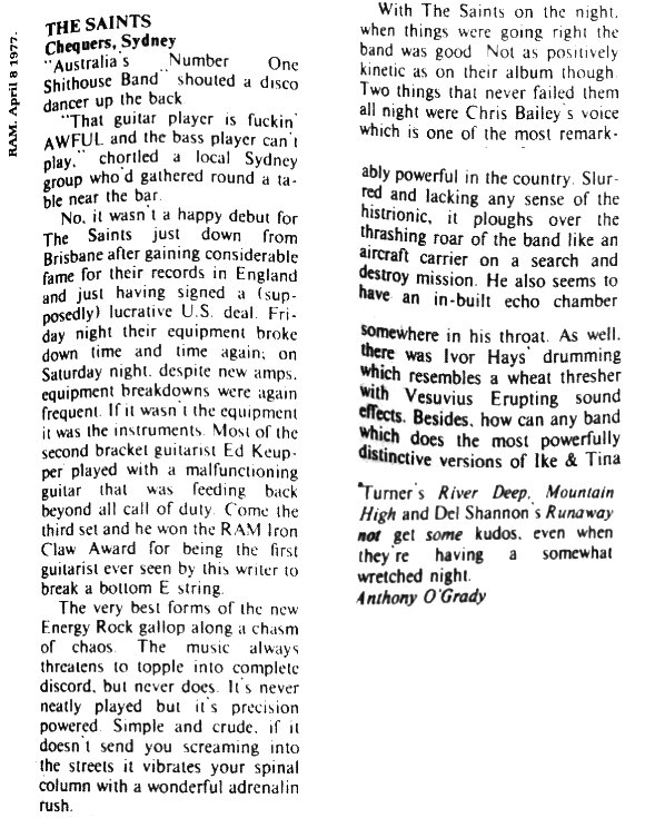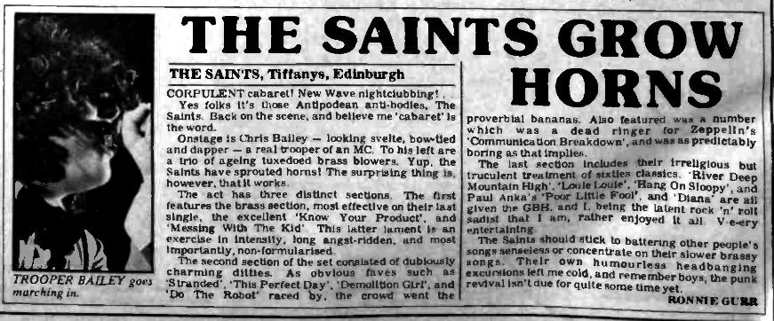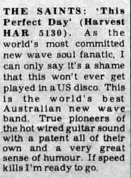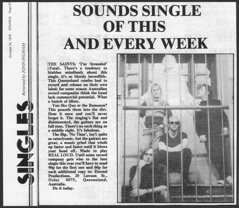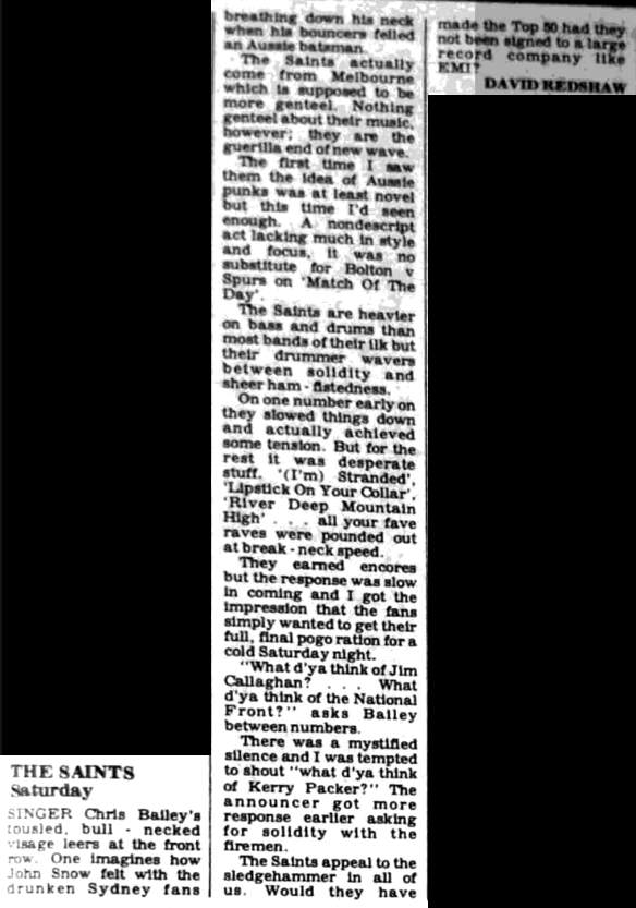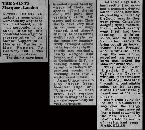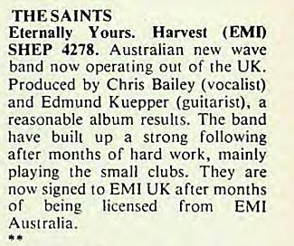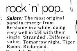 Note 1: "After a couple of months we decided to make another go of it, as the Saints. This time, Ivor changed to drums and we got another bass player and played our first really successful dance. It was on New Year's Eve around a swimming pool and the audience was great." Ed Kuepper in Sniffin' Glue #4 - Punk zine, October 1976.